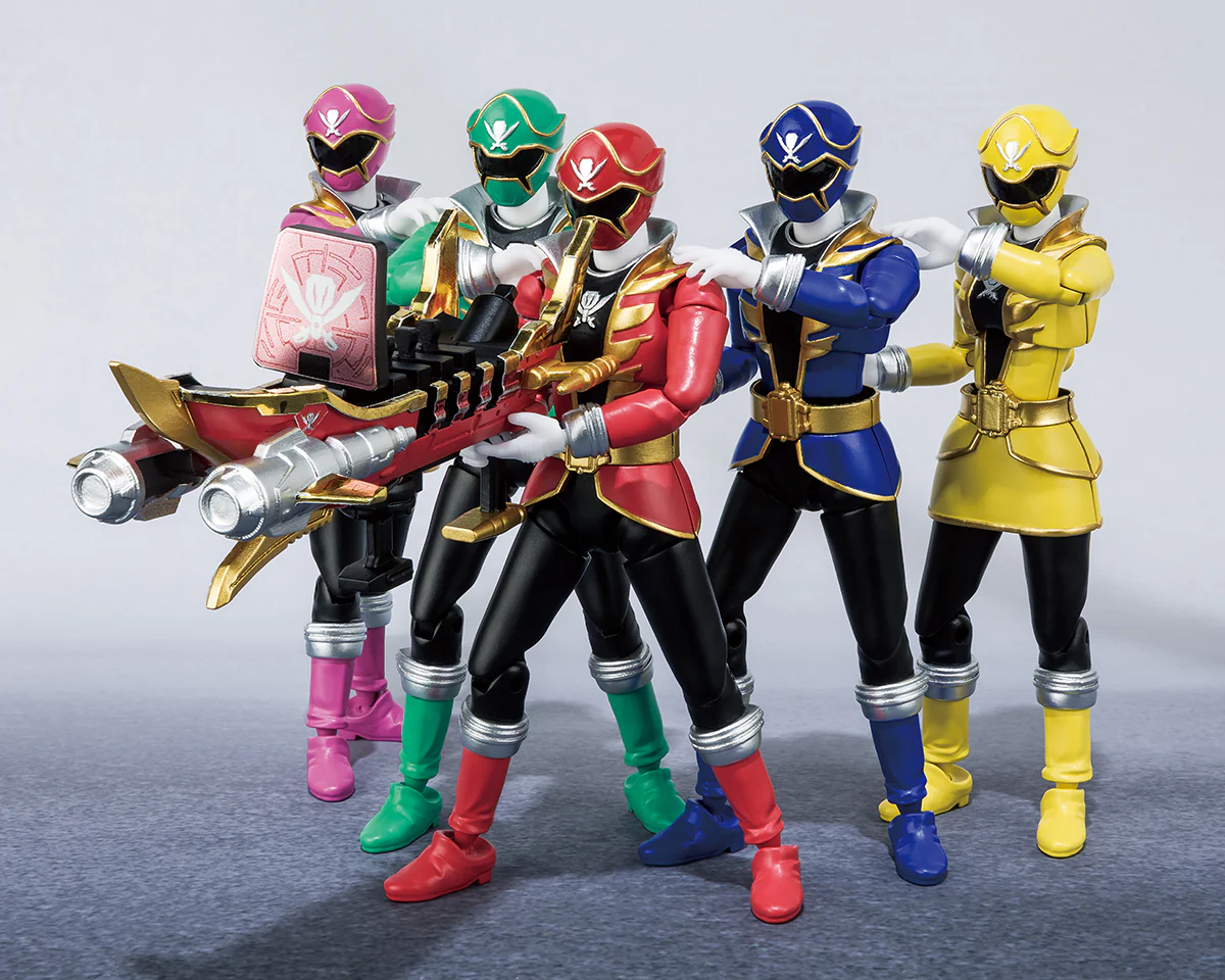 The first SHODO SUPER Gokaiger set features all 5 core rangers, as well as extra hands, mobirates (open and closed) and weapons for each. Navi is also included.